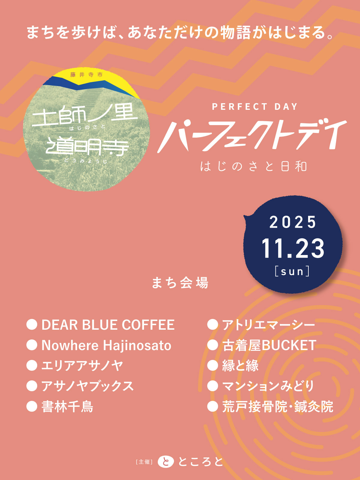 はじのさとでは近年、アートの展覧会や音楽、トークセッションやまち歩きのイベントなど、地域コミュニティによる文化的活動が盛んに行われています。「パーフェクトデイ」は、一般社団法人ところとが主催となり土師ノ里・道明寺エリアで開催している、アートや飲食に関わるイベントを集めた多拠点周遊イベントです。
